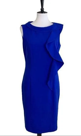Calvin Klein • Blue Side Ruffle Sheath Dress • 8 Style Details • Sheath dress • Wide round necklin... Show more