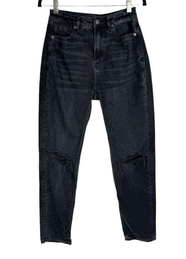 American Eagle Womens Jeans Sz 2 Mom Straight Jean Black wash denim Distressed High rise Whiskering... Show more