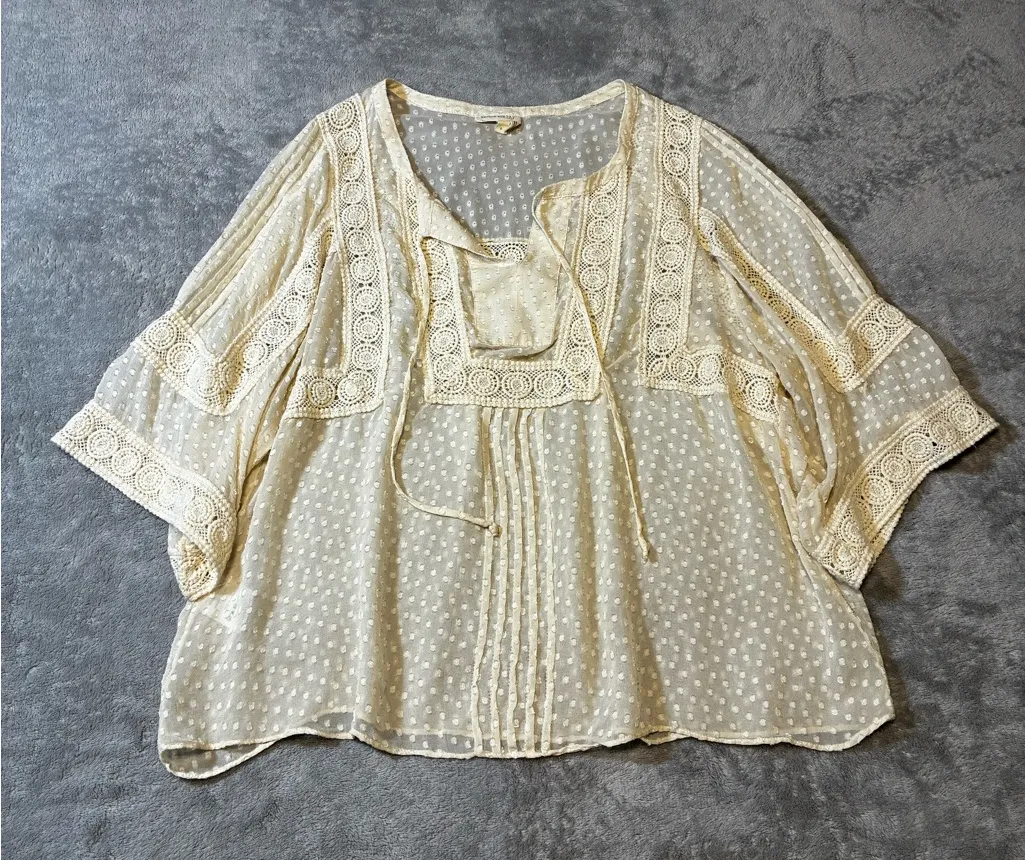 Meadow Rue 100% silk blouse. Good condition, no flaws, size large, cream shade. Features sheer fabric with Swiss dot texture, delicate lace trim, pintuck pleats, and flowy sleeves for an effortlessly romantic look. Lightweight and airy, lacey boho fairy core renaissance ethereal whimsical silk vintage-inspired. Review pictures for condition and true measurements.