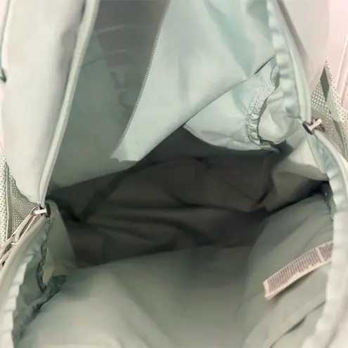 The North Face Jester backpack in sage green with burgundy logo. A versatile everyday backpack with a roomy main compartment, padded laptop sleeve, dual mesh side pockets, and front bungee cord system for extra storage. Lightweight, durable, and perfect for school, work, travel, or outdoor use.