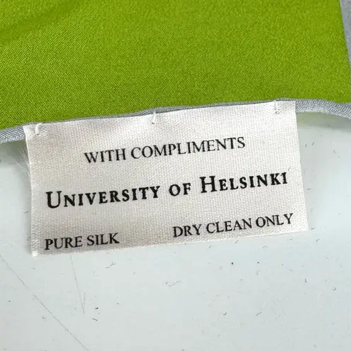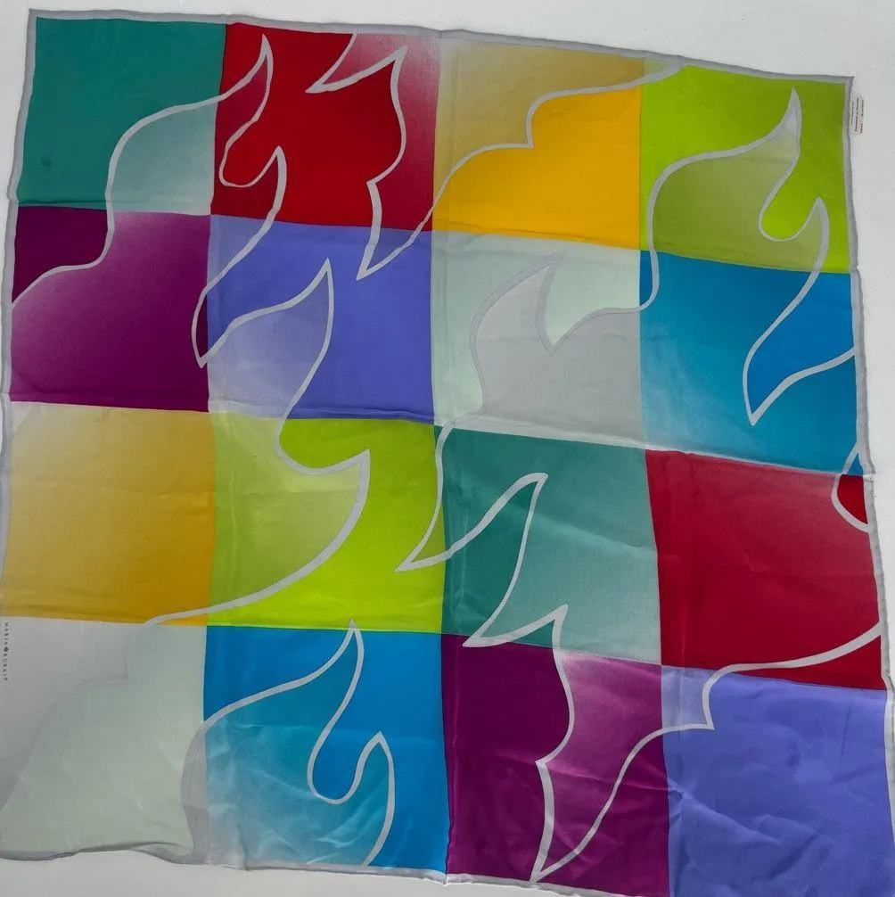 Vibrant silk scarf Geometric design Features reddish orange, purple, blue, green, and yellow blocks with the University of Helsinki logo in white outline in a large repeat Finnish designer Marja Kurki Colors may vary slightly from on screen images 100% Silk Dry Clean Only Tag reads: “With Compliments University of Helsinki” 33.5” x 33.5” Square Very good vintage condition