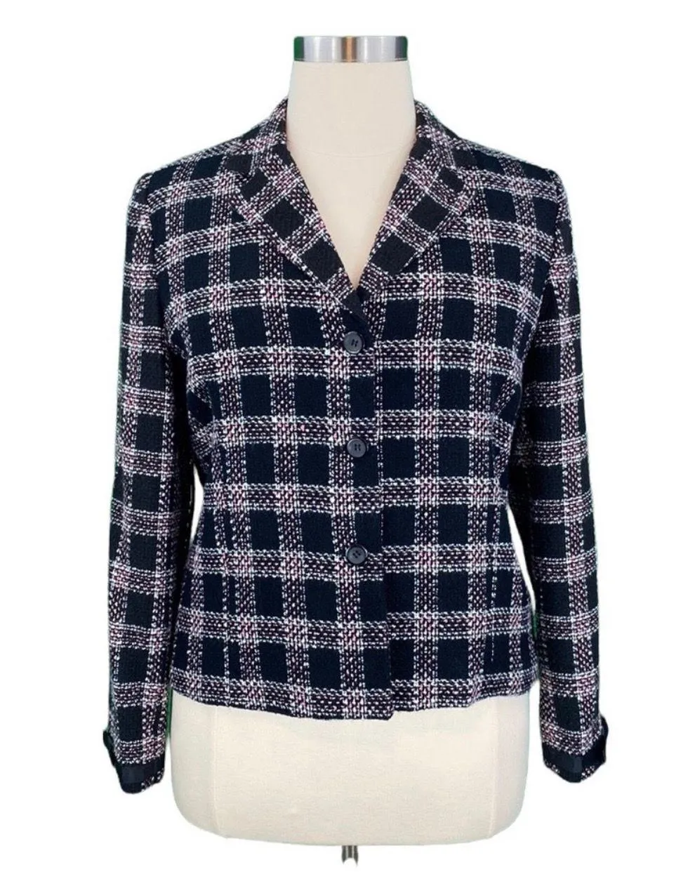 Requirements Petite Classic Black & Pink Plaid Tweed Long Sleeve V-Neck Jacket Size: 16P Bust: 22” Length: 23” Features: Black and Pink Plaid, Tweed, Petite, Medium Weight, Casual, Cute, Classic, Preppy, Slightly Padded Shoulders, Boho, Academia, Cold Weather, Fully Lined, Long Sleeve, Bow Detail on Cuffs, V-Neck, Button Down, Knit, Blazer, Jacket Good Condition: Jacket has some fuzzing, which is visible in pics. Shell: 100% Acrylic Lining: 100% Polyester Smoke Free/Pet Friendly Home J-4