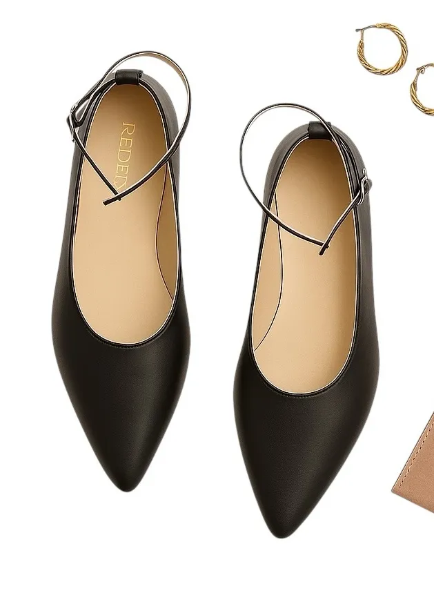 RÉDEN black leather ballet flats featuring a sleek pointed toe and slim ankle strap for a secure, flattering fit. Made from smooth, supple leather with a lightly cushioned footbed and flexible sole for luxurious comfort and all-day wear. The minimalist design delivers quiet-luxury elegance that pairs perfectly with both denim and dresses. Size EU 39.5 (approx US 9). Excellent gently used condition with minor creasing only. Clean interiors, solid soles, and smooth leather finish. Ideal for those seeking premium comfort in a chic, understated silhouette that elevates everyday looks effortlessly. #Reden #DesignerFlats #LeatherShoes #AnkleStrap #QuietLuxury