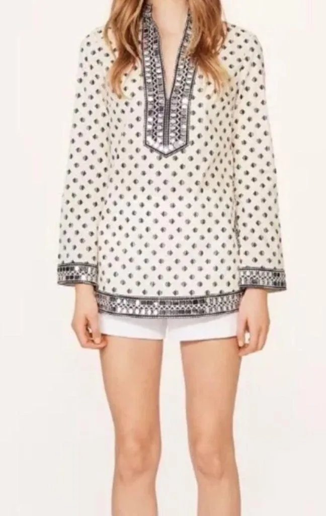 Tory Burch kingfish sequin trim tunic. Cotton tunic with sequined trim. Split neckline. Long slee... Show more