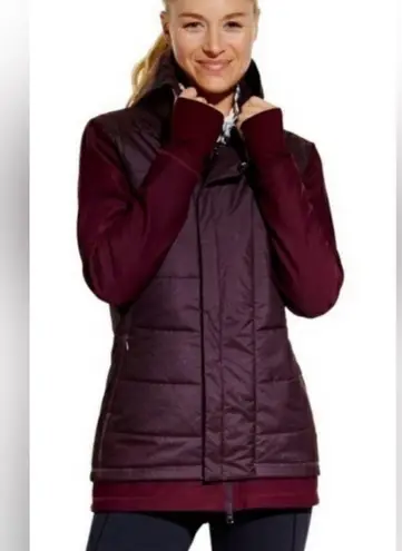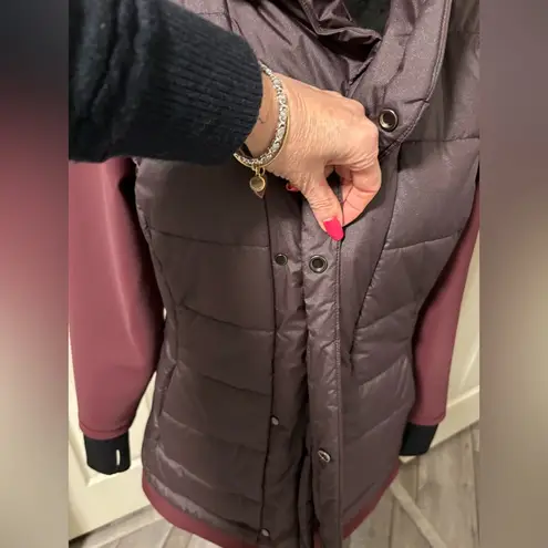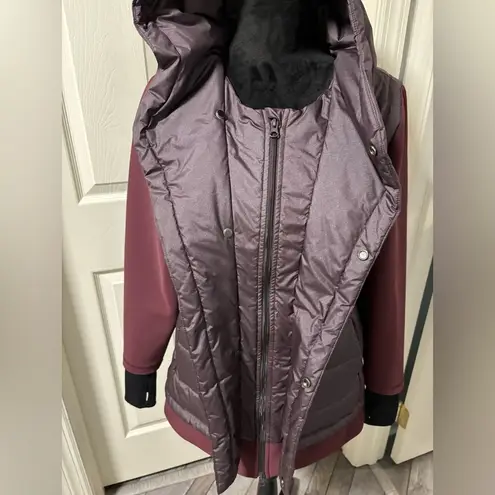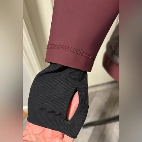 Excellent Condition Full zip front with snap closure Thumb holes The main material has a shimmer to it Arms are a heavier material (scuba knit) No material content tag Burgundy/Maroon/Dark wine Very nice and well made jacket! Pit to pit approximately 19” Shoulder to bottom approximately 28”