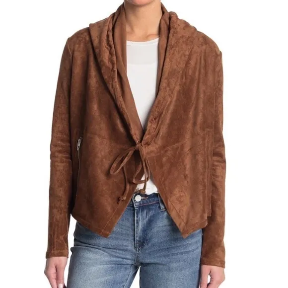 Blank NYC faux tan suede hooded jacket. Tie front draped style. Size small.