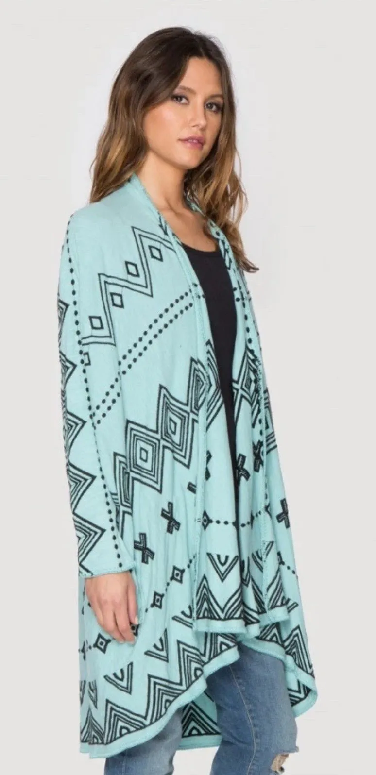 Excellent Condition The Johnny Was Biya Genoa embroidery sweater wrap in turquoise is a stylish and versatile piece for women. Made from 100% cotton with intricate Aztec and bohemian embroidery, this relaxed fit sweater features long sleeves and a collarless, open design. The oversized, lightweight wrap is perfect for layering over any outfit and adds a touch of artistry to your look. Made in India, this sweater embodies a unique blend of comfort and style that is sure to make a statement.