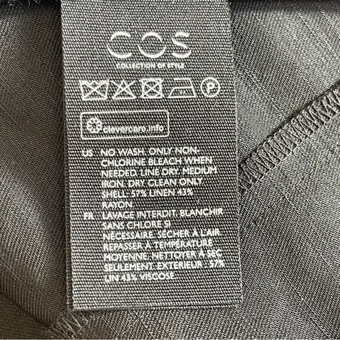 Brand new with tags COS dress. Linen blend Elastic band inside at waist Color: black Size: 12 57% linen. 44% rayon Waist 15” flat measure (elastic and stretchy) Pit to pit 19” The dress is stretchy in waist and chest. Length 40” All measurements are approximate Very high quality