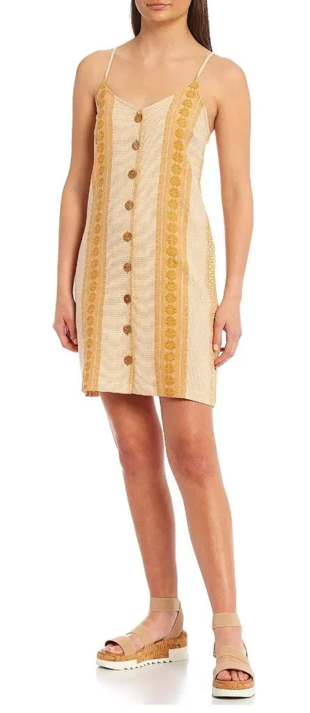 Rip Curl Alma Front Button V-Neck Stripe Mini Embroidered Dress Beige/Gold Size Large Preowned