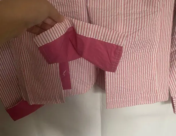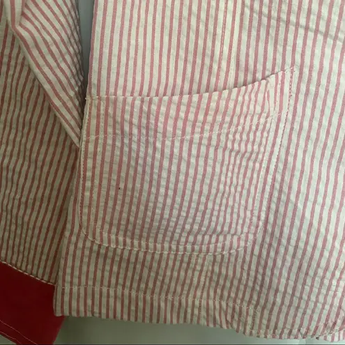 PERISCOPE Womans Pink White Pinstriped light career Jacket Striped Blazer Lined Coat. Periscope Blazer Pink White Seersucker Blazer Med Periscope Womens Blazer Size Medium. Very nice pink and white striped seersucker, lined with cuff-able sleeve. 100% Cotton one-button front jacket. ***CAN BE BOUGHT WITH THE MATCHING PANTS IN ONE OF PICS*** item#603B •Tag Size: Medium •EUC •No Flaw LOC#602B *Approximated Measurements: •Armpit to armpit: 18” •Sleeve to shoulder seam: 23” •Length:21”