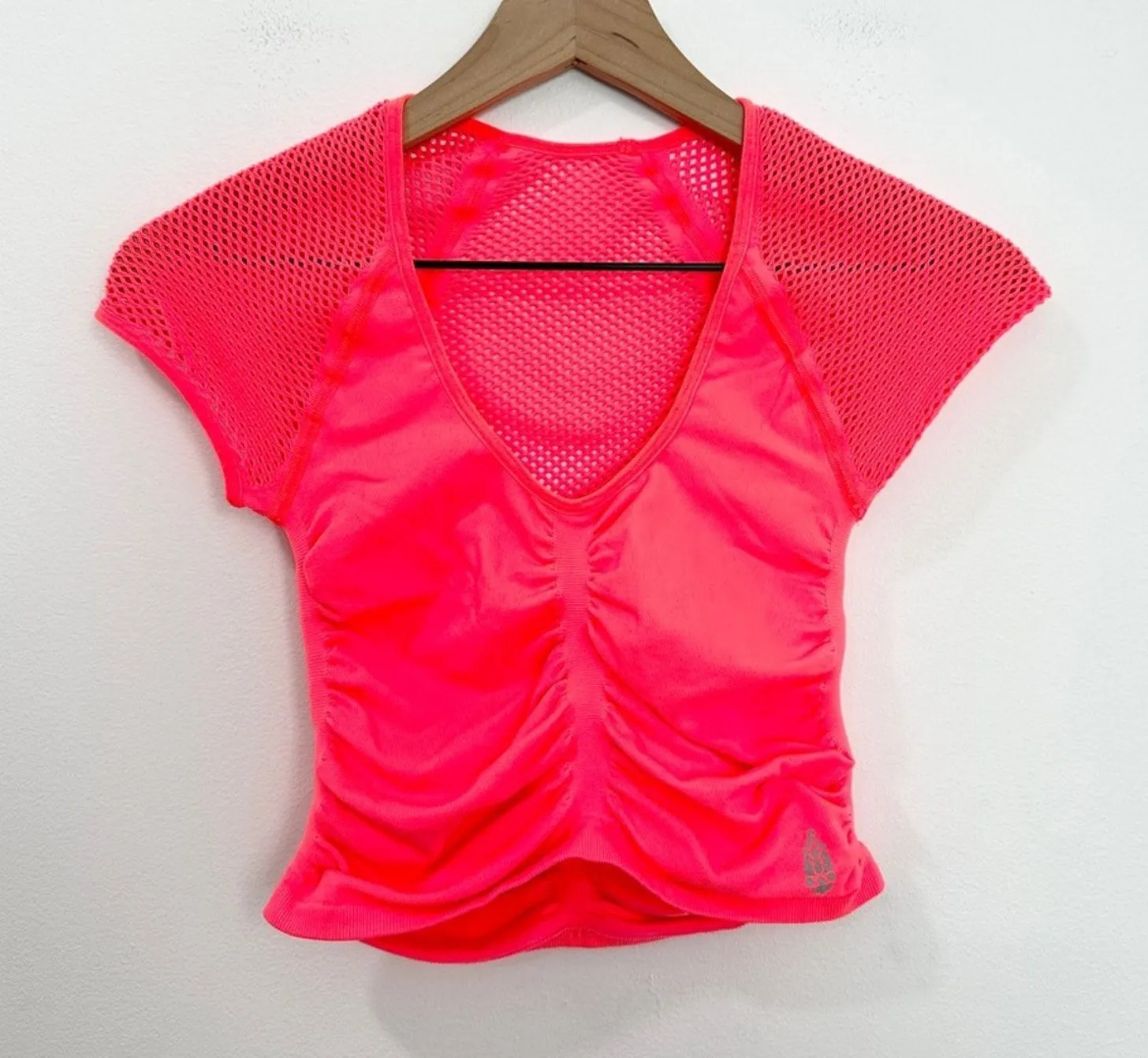 Free People Movement Free For All Short-Sleeve Athletic Top size XS Small Formfitting, slightly cropped Soft fabrication with a stretchy feel mesh paneling throughout scoop neckline ruched detail throughout the body cap-inspired sleeves contrast seaming throughout Neon coral pink Approximate measurements ▪️pit to pit: 11” flat across ▪️Condition: Preowned / no stains or holes