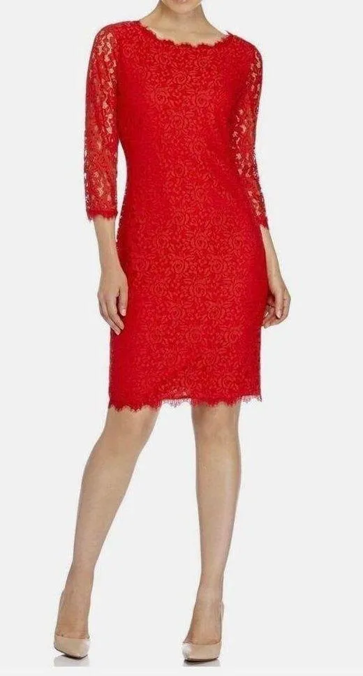 $395 DVF Diane Von Furstenberg Colleen Long Lace Dress Size 0 Red Knee Length