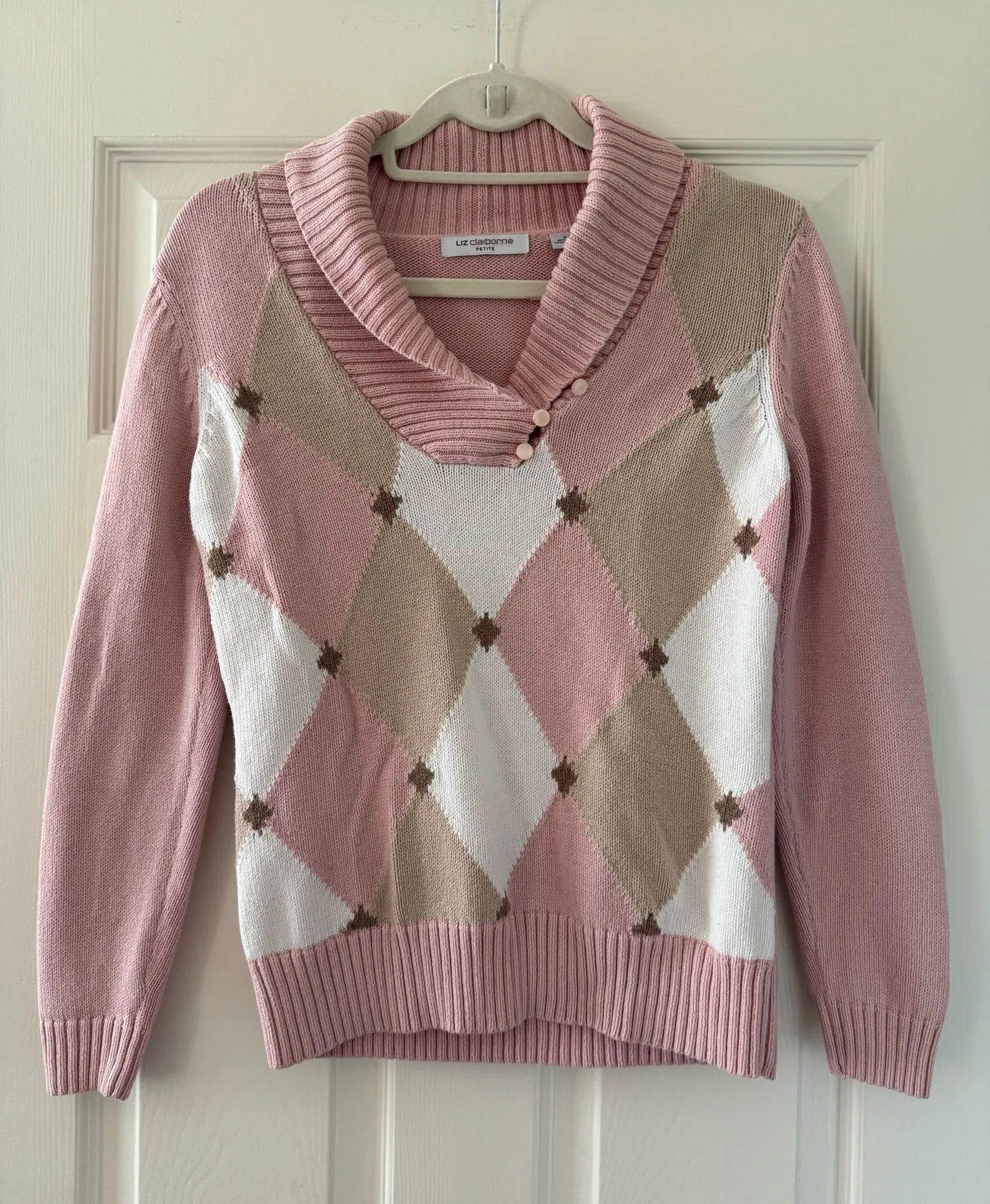 Liz Claiborne Pink, White & Beige Argyle Cotton Knit Sweater size Medium Petite 100% cotton, the c... Show more