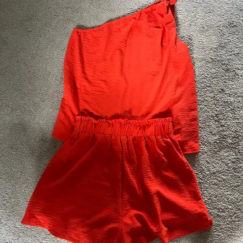 Elegant red orange set in a chic red hue. Ideal for any occasion. (One shoulder top and short bottom... Show more