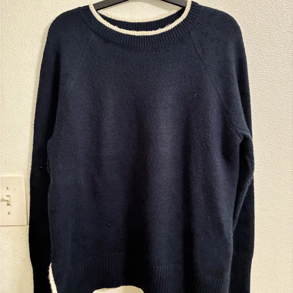 Cozy navy blue sweater featuring a stylish white trim. Perfect for casual wear. Length 25 1/2” Slee... Show more