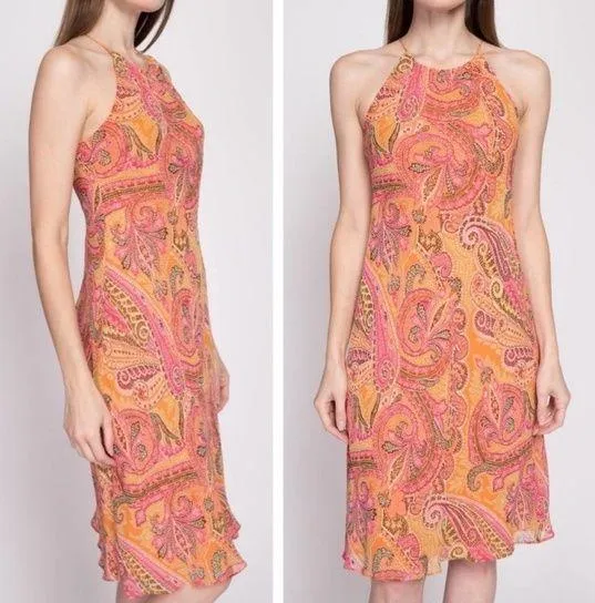 Features: bias cut, slip dress, interior lining, flutter hem, boho, watercolor paisley print patterning, high neckline, adjustable tie back, coral pink, orange, white, earthen brown & green accent coloring, 1990s, throwback, classic bohemian styling, indie sleeze, funky, groovy, retro inspired, flirty, feminine, spring, summer, brunch, weekend event, travel, garden party, wedding guest, midi, tea length, everyday luxe, lightweight luxury fabric, flowy, designer brands, classic contemporary, casual, approachable, everyday femme