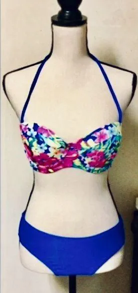 Bikini with cobalt blue bikini bottoms and a floral halter top. Size medium. In excellent condition.