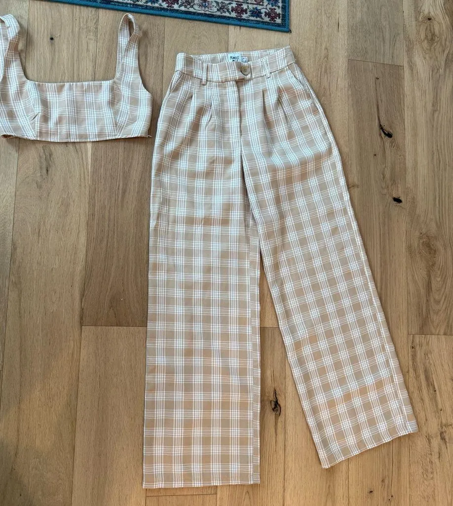 Elevate your style with this chic plaid tan pants and jumpsuit set. Perfect for any occasion, this s... Show more