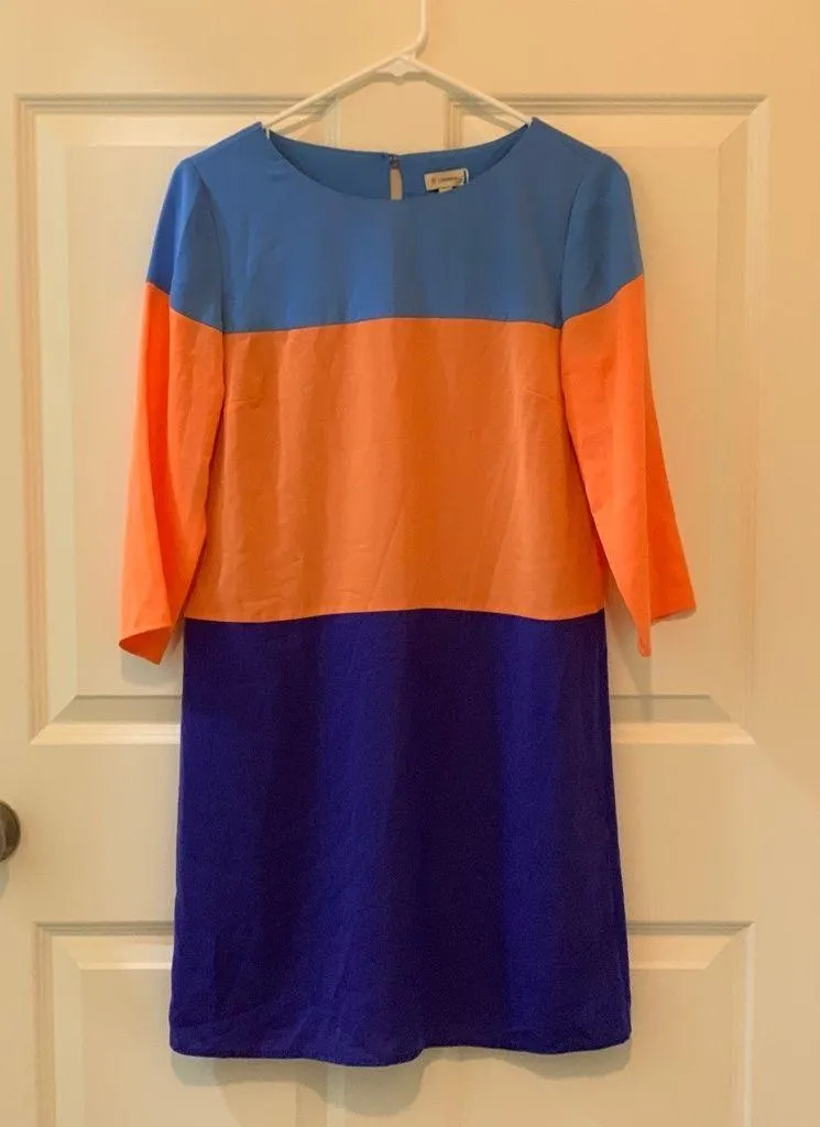 Preowned and in good condition! Chic 3/4 sleeve dress with bold blue and orange blocks.knee length.I... Show more