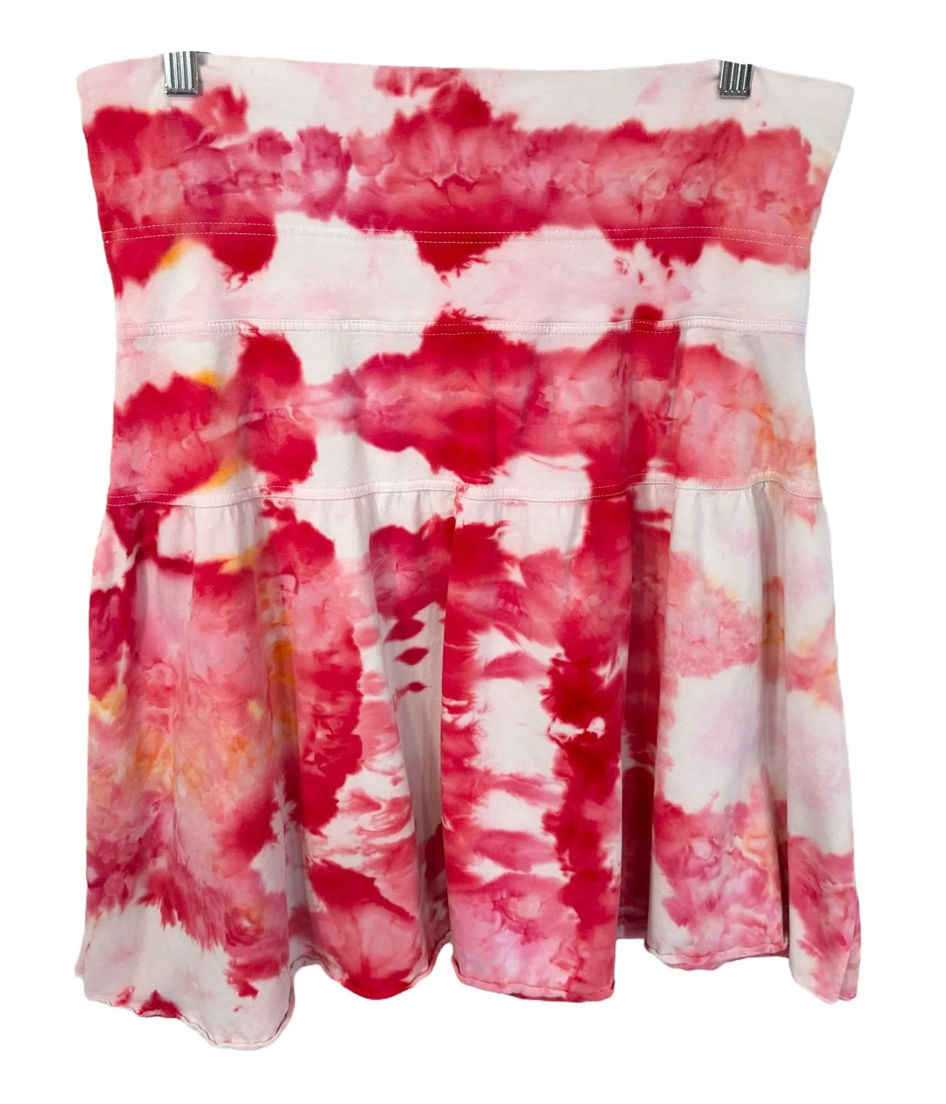Summer-ready skirt featuring a vibrant tie-dye pattern in shades of pink. This stylish skirt boasts a comfortable elastic waistband and a tiered design that creates a flattering silhouette. The skirt is perfect for warm weather and casual occasions. The unique tie-dye design ensures that each piece is slightly different, adding to its individual charm.