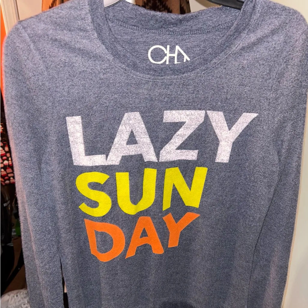 Cozy gray long sleeve shirt with 'Lazy Sunday' print in white, yellow, and orange.