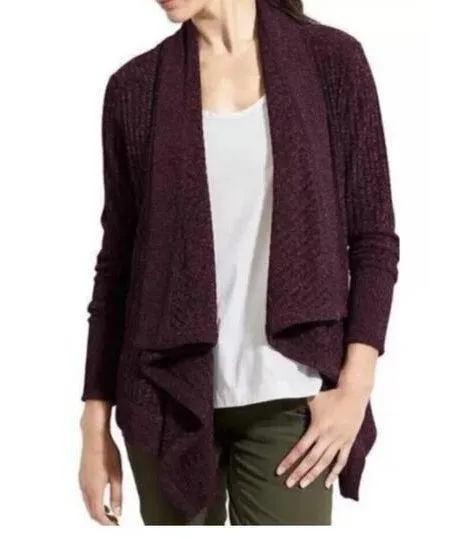 Athleta Tiburon Burgundy Cardigan Sweater open draped front very soft stretch fabric ribbed detaili... Show more