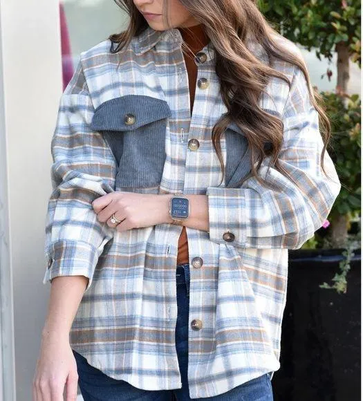 Mine Plaid flannel button-down shirt with corduroy chest pockets Great used condition, size M Corduroy double chest pockets with button flaps Plaid Flannel Contrast Shacket Color: Blue Plaid Long sleeves with banded button up cuffs Collared neckline Relaxed shacket Shell: 100% Cotton Pockets: 85% Polyester 15% Nylon Measured flat: Pit to pit 23" Length 29" 16.8