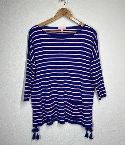 In good condition with no flaws Size small Lilly Pulitzer Elba sweater in blue/ pink stripes Leng... Show more