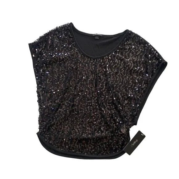 Features: Rhapsody Sheer Black Sequin Short Cap Sleeve Blouse Shirt; front of shirt is sheer and meant to be layered, sparkly sequins on the front, round neckline. Size: large Condition: New with tags gifts for her, casual, chic, relaxed, stylish, trendy, feminine, bohemian, retro style