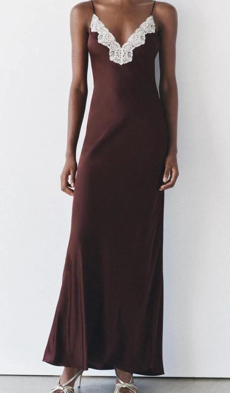 NWT Zara Silky Lace V-neck Slip Maxi Dress in Burgundy - S New with tags! Sold out style! GORGEOUS... Show more