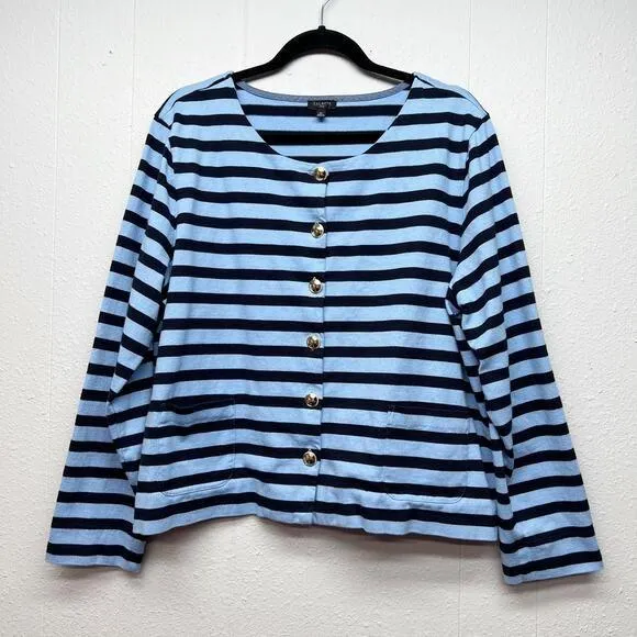 Talbots women's cardigan sweater. Striped black & blue. Round neck. Button down. Long sleeves. Natur... Show more