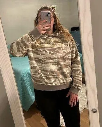 Women’s size medium Puma hoodie. Medium crop top sweatshirt. Tan and brown camo with gold Puma lette... Show more