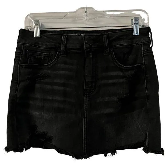 . Belt loops. Front & back pockets. Distressed details. Frayed hem. Mini length. In good pre... Show more