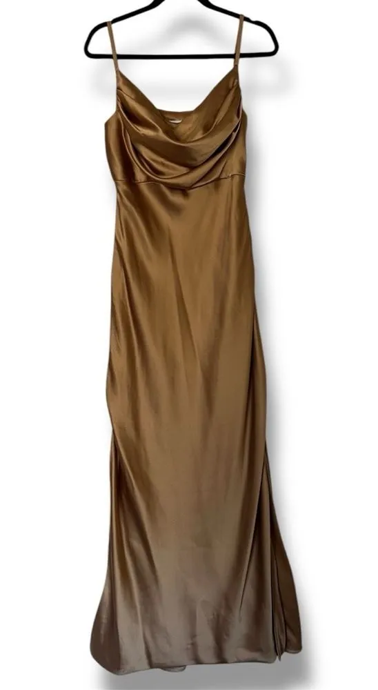Our Skye dress is a fresh take on a classic gown. With a cowl neck in the front and knee-high slits on both sides, you'll feel comfortable but elegant all night! Skye is crafted from a semi-shine charmeuse satin and lined with an additional fabric. Skye has built-in bra cups. Zipper is located on the side. Our Charmeuse Satin fabric is a smooth, lustrous fabric constructed with a satin weave and 100% polyester fibers. This luxe Satin is shiny on the front side, with a matte finish on the back side. Our Satin is cut on the bias, meaning there is some stretch, and it is notably soft and gracefully flowy. Great used condition