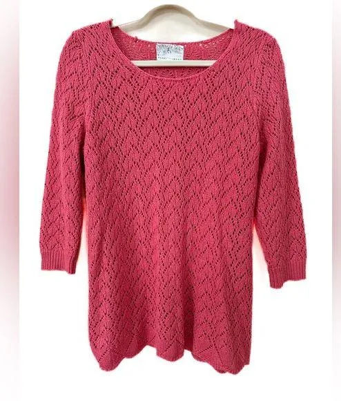 Just a cute crochet, open knit sweater, a salmon pink. Perfect to wear every day, or dress her up with some jewelry. 3/4 sleeves, scoop neck. Feminine, Cottagecore, Grandmacore, Business Casual, Daily Wear