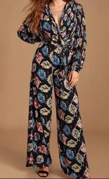 Lulus jumpsuit NWT Size XS Black Leaf print Roni Pleated Balloon Sleeve … - $39 (50% Off Retail) New With Tags - From Tiffany
