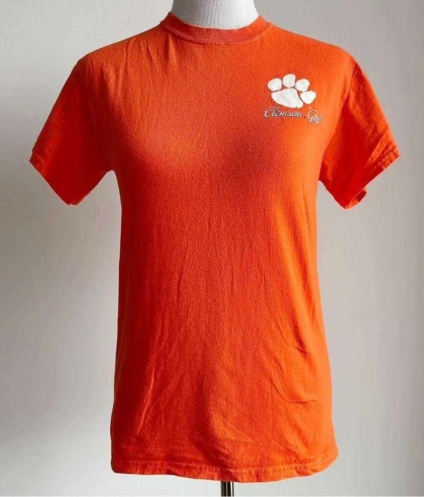 CLEMSON TIGERS CLEMSON GIRL T-SHIRT WOMENS SMALL • Pre-owned • Womens size small • Short sleeves • Orange, white • “Clemson Girls Love Clemson Boys” across back with black and white photo of a boy and girl holding hands • “Clemson Girl” on chest with tiger paw print logo • 100% cotton