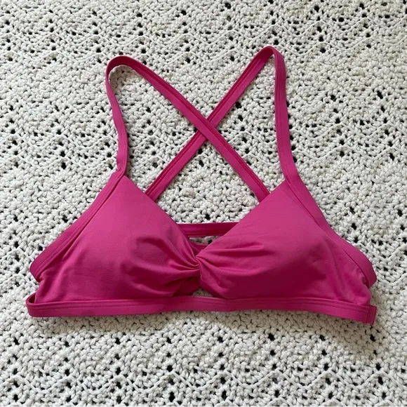 Abercrombie & Fitch Twist Front Strappy Back Swim Bikini Top in the color Pink. Twist cutout in fron... Show more