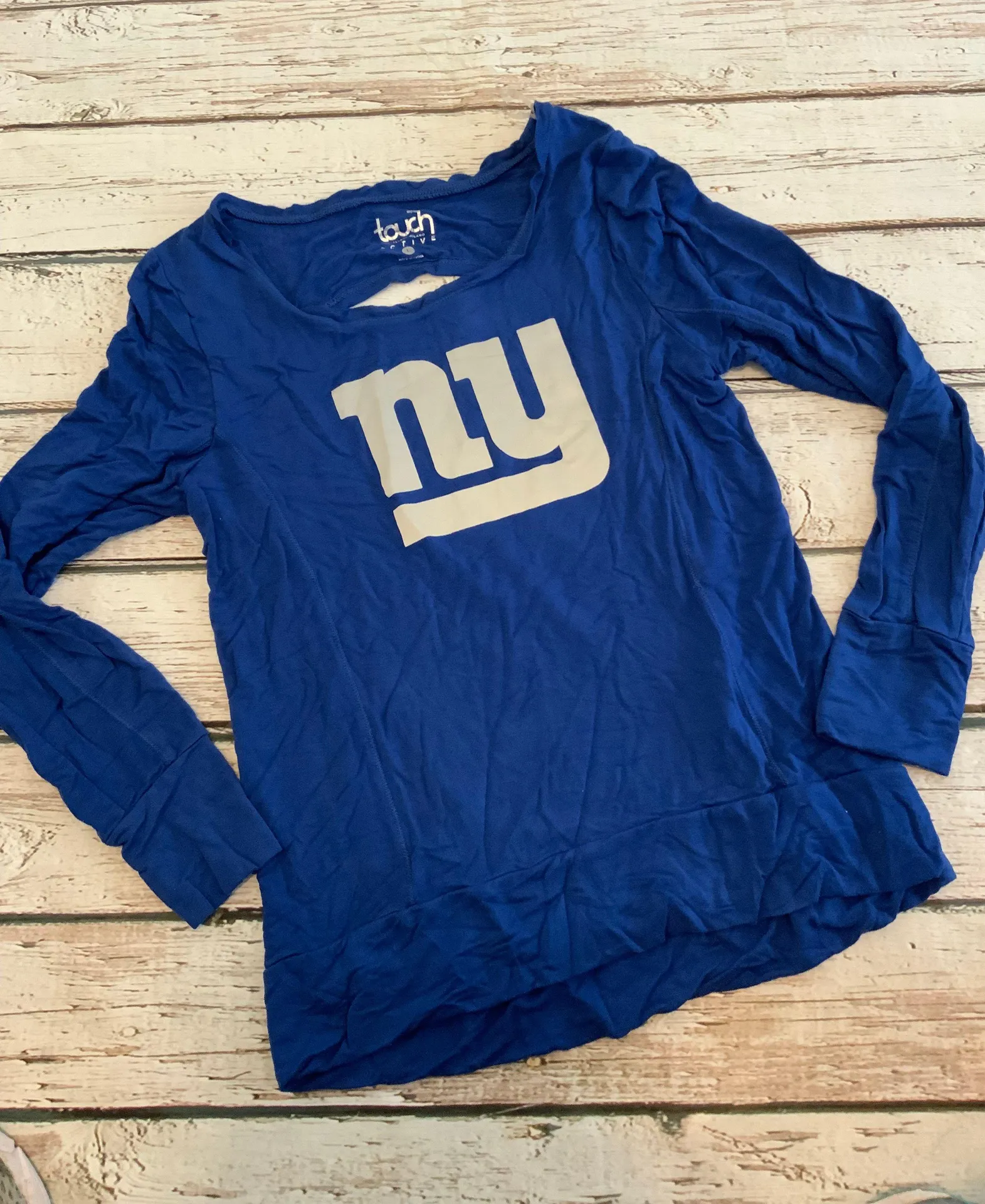 Show off your love for the New York Giants with this Touch by Alyssa Milano Long Sleeve Open Back T-Shirt. The blue shirt is made with a regular fit, long sleeves and a comfortable fabric that is perfect for travel or casual occasions. The shirt features the Giants logo as an accent, making it a great addition to any sports-themed wardrobe. This T-Shirt is designed for women and comes in a size L with a regular size type. The open back design adds a touch of elegance to the shirt, making it suitable for any occasion. The breathable fabric ensures that you stay comfortable all year round, making it an all-seasons wear.