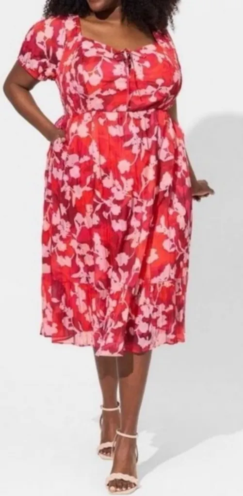 BRAND NEW from Torrid! Gorgeous red/orange floral dress in Plus Size 0X! Smocked stretchy bust, puf... Show more
