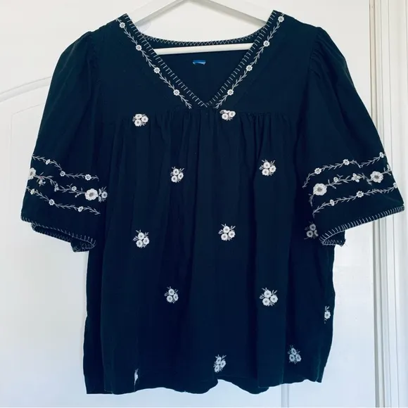 Old Navy Black with Embroidered Flowers Cute Boho Peasant Top Size: M Brand: Old Navy