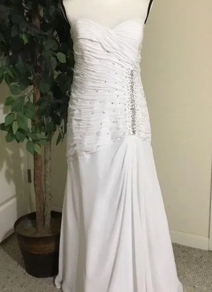 Beautiful Kerishma floor length white silky feel gown over slip and tulle. Pleated bodice. Built in bra. Zips down the back. Silver sequins and rhinestones. Able to let out about 8” in bodice No rips, tears or stains. A few smudges from wearing. Dusty. Could used a good dry cleaning. Comes with garment bag Approx measurements 32” bust 30” waist 52” bust to hem Wedding dress Prom dress Mardi Gras Ball Dress