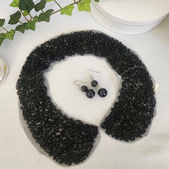 Beautiful collar necklace and earrings set Black glass beaded collar 16" in length Hook and eye close Hook style black glass bead drop earrings @28 collar dressy work office fashion staple everyday simple style classic timeless elegant black glass