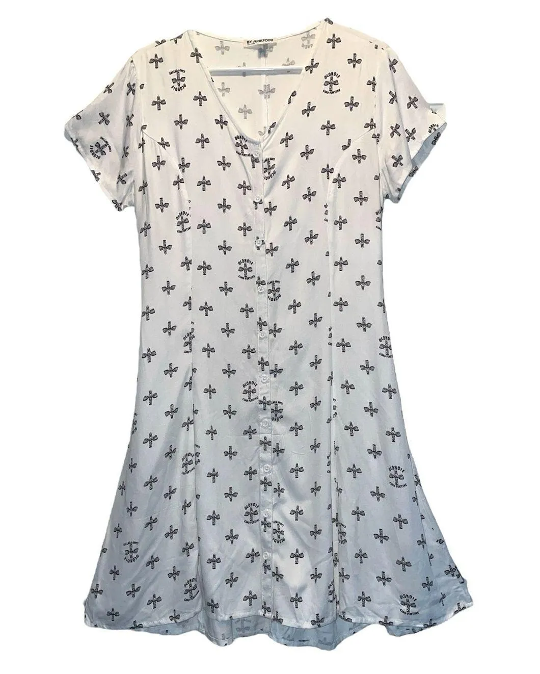Rock by Junk Food Women's High Low Button Front Blondie Camp Funtime Dress Cap sleeve Tie back waist Fun, funky CAMP FUNTIME all over print Full front button down Swing high-low hemline Great preloved condition, call out one tiny mark back left shoulder Chest 38" & Length 37.25” in front & 39” in back from shoulder to hem size Large