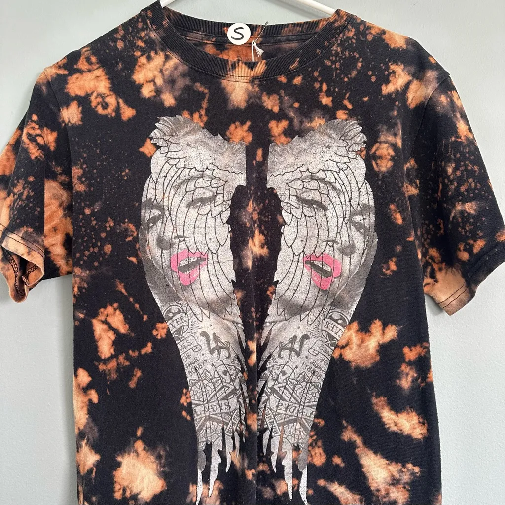 Stylish black and orange tie-dye t-shirt featuring a unique graphic design. Marilyn Monroe Angel Reverse Tie-Dye Graphic T-Shirt small Custom, one of a kind. Machine wash cold, hang dry only. Size small. Pit to pit: 18. Length: 25.