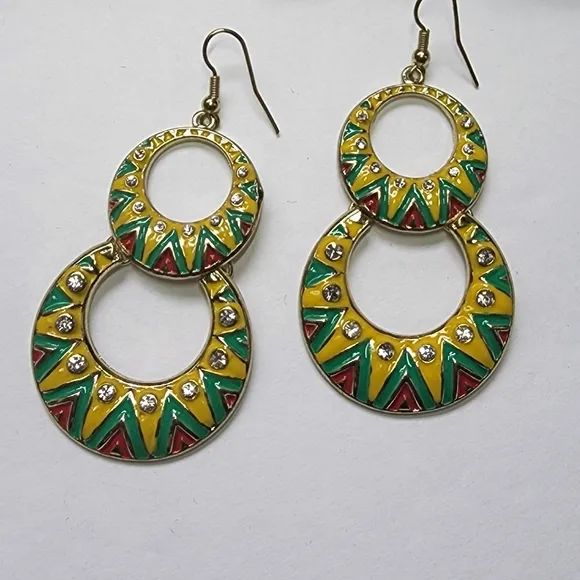So colorful Double Hoop drop earrings Yellow, green and red in color Accent crystals Set in Goldtone metal Hook style New #29 Trendy Bohemian enamel colorful colorful crystals
