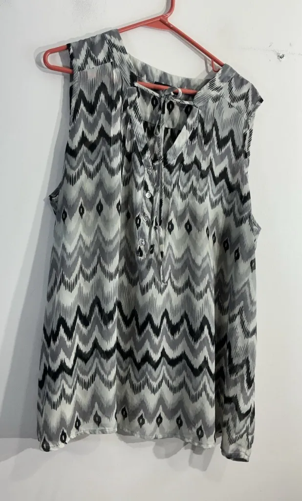 The Women's Violet & Claire Blouse is a stylish and versatile option for plus-size women. This sleeveless blouse features a geometric pattern in black/gray/white multicolor, with a tie V-neckline for a flattering look. Made of sheer polyester material, this blouse is perfect for adding a touch of elegance to any outfit, for a casual day out. The basic style and quality brand ensure that this blouse is a timeless addition to any wardrobe. Approximate measurements; Pit to Pit 25.5” (51”) Length 30” This blouse is pre owned and looks to be in good condition!