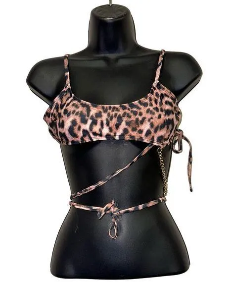 EUC Shein Leopard Print Strappy Bikini Top Gold Chain Padded Size: S