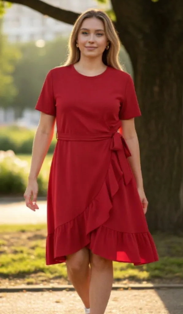 Scuba crepe fabrication Jewel neckline Short sleeves Waist tie belt Lined Ruffled hemline Center bac... Show more