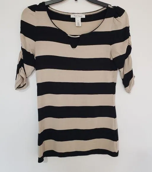 White House Black Market WHBM Striped Ruched Elbow Sleeve Hardware Detail Tee Size XS. A162